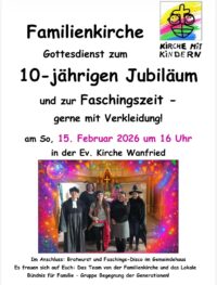 Feiern Sie heute mit Pfarrerin Kremmer und Team das Jubiläum "10 Jahre Familienkirche" mit Grillen und Faschings-Disco. Die Kirchenspatzen singen in diesem Jubiläumsgottesdienst. Beginn: 16:00 Uhr in der Ev, Kirche zu Wanfried
